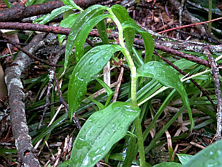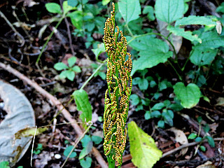 | 平成29年6月24日 サイハイランを見つけた落倉自然園 美ヶ原から栂池の民宿へ向かう途中、翌日は雨のようなので1日早く落倉自然園へ寄りました。ミズバショウはお化けのような葉ばかりになり、これといった花は見当たりませんでしたが、そのかわり、ここで初めてサイハイランを見ることができました。 |