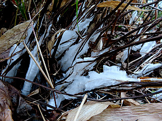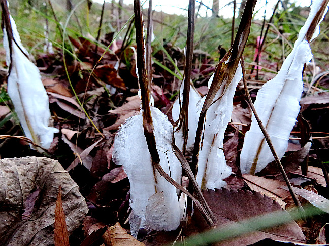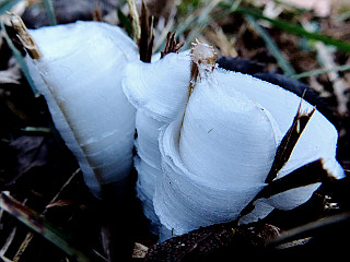 | 令和5年1月7日 シモバシラの霜柱が終盤を迎えた五葉湖畔 この冬は、12月から観られた五葉湖畔のシモバシラの霜柱ですが、そろそろ数も少なく大きさも小さくなり、そろそろ終盤といった感じでした。それでも、その方が、シモバシラの霜柱の形状を観察するのにはいい感じなのかもしれません。 |
