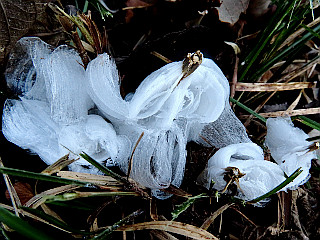 | 令和5年12月22日 シモバシラの霜柱が観られる五葉湖 今季最大級の寒波に見舞われた朝、五葉湖では今季初のシモバシラの霜柱を観ることができました。思ったよりも小さなものでしたが、形が面白く、それはそれで楽しむことができました。 |