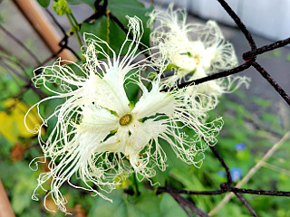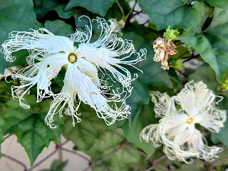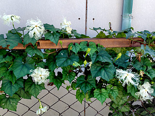 | 令和6年9月18日 キカラスウリが咲く豊川市宿町地内の工場のフェンス 私の通勤経路にある工場のフェンスで、キカラスウリが咲いています。キカラスウリは、夜咲いて朝には萎んでしまうのですが、朝8時頃通った時にまだ咲いていたので、スマホで撮影しました。 |