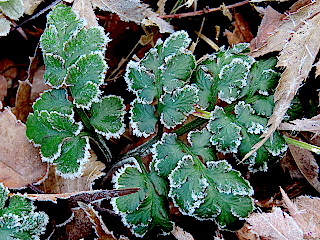 | シモバシラの霜柱 | 縁に霜の付いた葉も面白い | ますます水位が下がる五葉湖 | |