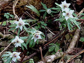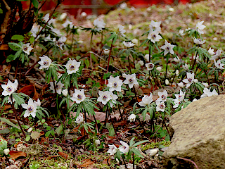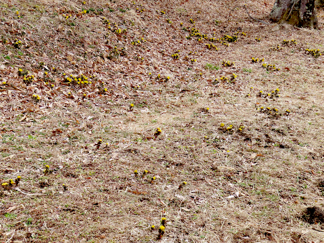 | 令和8年2月5日 セツブンソウが咲き始めた石雲寺と池場地区の群生地 通路が整備された石雲寺ではセツブンソウが満開になり、平日ですが多くの人が訪れていました。一方、池場地区は私有地ということで立ち入りが禁止されていましたが、セツブンソウはいい感じで咲いていました。 |