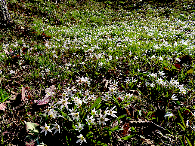 | 令和8年3月5日 ヒロハノアマナが最盛期を迎えたカタクリ山 吉祥山へ向かう途中、様子を見に寄ったカタクリ山で、一株だけカタクリが咲いているのを観たので、帰りに寄ることにしました。すると、朝は蕾だったったヒロハノアマナが一斉に咲いていて見事でした。そしてそのカタクリも一輪だけ綺麗に咲いていました。 |