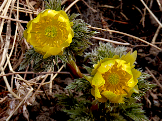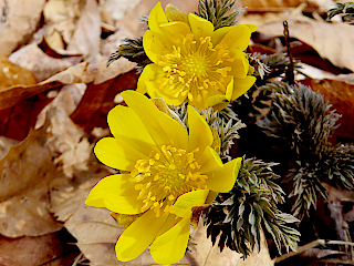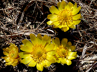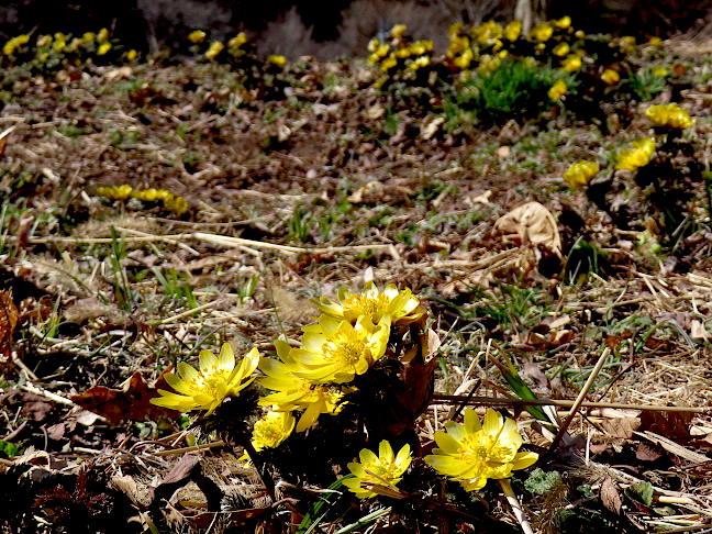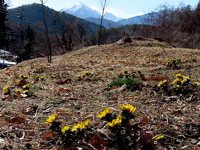 | 令和8年3月13、14日 フクジュソウが咲く大町市新行地区 例年より雪解けの早かった大町市新行地区の水田の畔では、フクジュソウが沢山咲いていました。曇りだった13日に訪れた時には花が閉じかけていたものが多かったのですが、14日に改めて訪れた時にはいい感じで花開いていました。 |