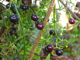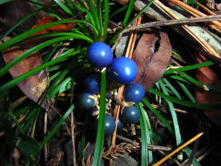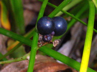ジャノヒゲの実(20061125)ユリ科 細い葉の中にまるで宝石のような紺色の美しい実をつける。 |
