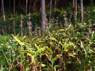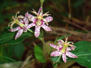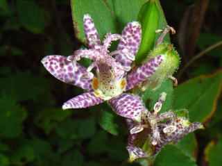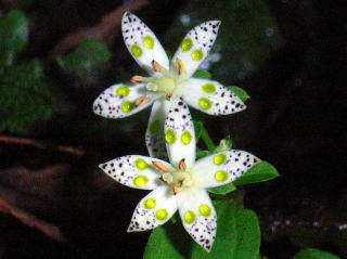 ヤマジノホトトギス(20070908)ユリ科 ホトトギスと似ているが、花が途中から横に平開する。 |