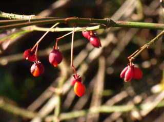 ニシキギの実(20071111)ニシキギ科 花も実もコマユミと一緒だが、枝にコルク質の板状の翼がある。紅葉はその名のとおり美しい。 |