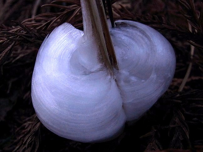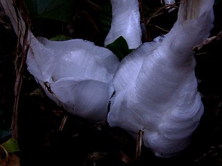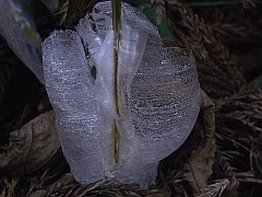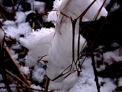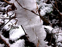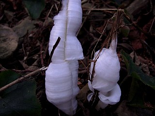 林道終点→林道終点 | 大雪に見舞われた吉祥山。今年は寒波のため、この地方では珍しい大雪に見舞われました。そのため、ここ数年見ることができた初日の出を見るどころか、スタッドレスタイヤでも不安なぐらいの道路状況でした。それでも、冷え込んだおかげで、今シーズン、吉祥山では初めてのシモバシラの霜柱を見ることができました。 |