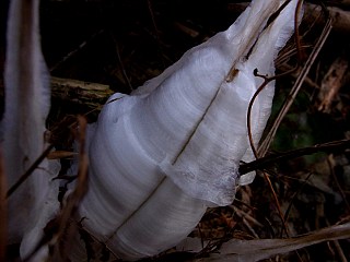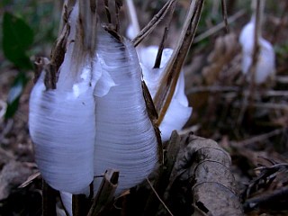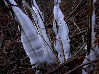林道ゲート→林道ゲート | シモバシラの霜柱を堪能した吉祥山。この日一段と冷え込むという予報を聞いて、居ても立ってもいられず休日出勤の振替休暇を半日とって吉祥山へ駆けつけました。予想通り各所で見事なシモバシラの霜柱を見ることができました。今まで知らなかった場所まで知ることができて、大変収穫の多い日になりましたが、その寒さは尋常ではありませんでした。 |