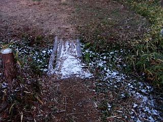 | ガスの立ち込める富岡の里 | 林道には雪が残る | 落ち葉に積もる霜 | |||