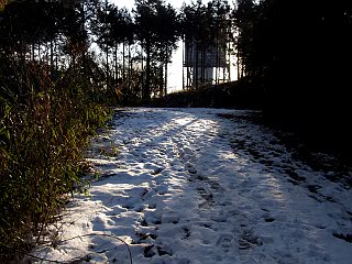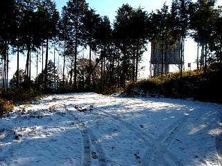 | 吉祥天女の祠付近の椎の大木にも雪が | 山頂から見る新城市街地方面 | 豊川市街と通行止めの東名高速道路 | |||