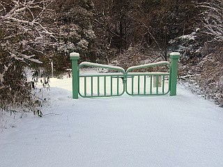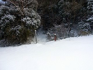 | まだ新雪のままの新城側登山口 | 林道ゲート | 木の枝にも沢山の雪が積もっている | |||