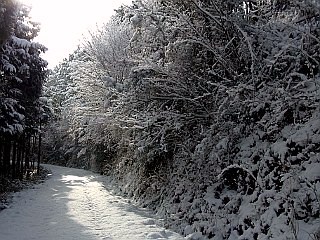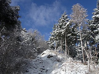 | すっかり雪で覆われた林道 | 新雪を独り占め | 青空が眩しい山頂付近 | |||