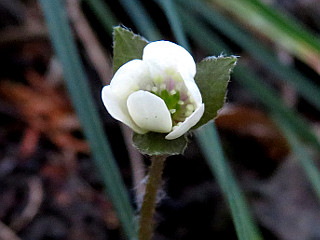 林道ゲート→(C)→(B)→林道ゲート | ミスミソウを1輪だけ見つけることができた吉祥山 暖冬で、冬らしさが感じられない今年、ミスミソウも早くから咲いているのではないかと訪れた吉祥山では、かろうじて、開き切っていないミスミソウを一輪だけ見つけることができました。また、雲が多く、あまり期待していなかった富士山もしっかりと見ることができ、収穫は十分でした。 |