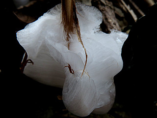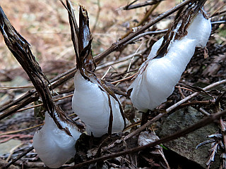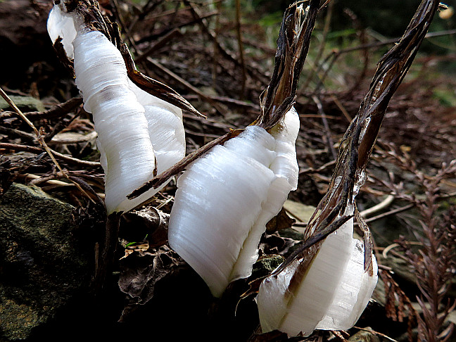 林道ゲート→林道ゲート | シモバシラの霜柱はまだだったがようやく雪を被った富士山を見ることができた吉祥山 大晦日から元日にかけて強い寒波に見舞われるということで、この日の朝も冷え込んでいたので、シモバシラの霜柱を期待して、また吉祥山を訪れたのですが、普通のシモバシラはありましたがシモバシラの霜柱はまだのようでした。それでも、空気は澄んでいて、ようやく雪を被った富士山や南アルプスなどをはっきりと見ることができました。一方、帰りに寄った五葉湖では、シモバシラの霜柱をいくつかの場所で見ることができました。 |