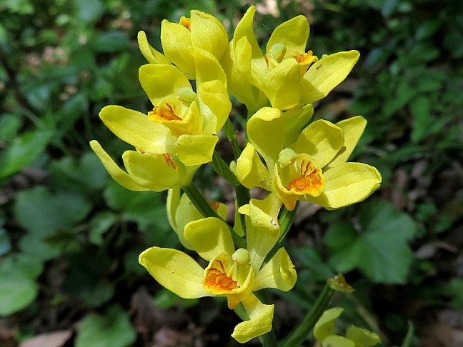 休憩所→A→(B)→林道ゲート→(C)→休憩所 | キンランが少ない吉祥山 キンランを探しに訪れた吉祥山ですが、時季が早かったのか遅かったのか、あまり見ることができず、見られたものでも大きい株はありませんでした。その外の春の花は、少し遅れ気味ですが、順調に咲き始めているようです。この日山行中に出会った人は2人でした。 |