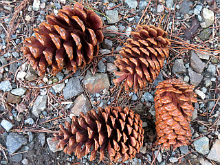 | 山頂から見る富士山 | 林道終点手前から見る南アルプス | 立派な松ぼっくりがいっぱい落ちていた | |||