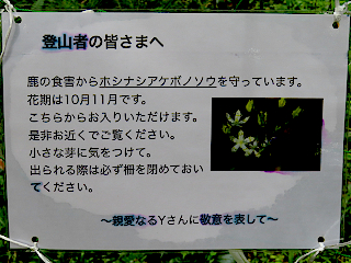 C駐車場→(C)→(A)→(B)→吉祥山→林道ゲート→吉祥天女→北尾根→C林道→C駐車場 | ホシナシアケボノソウの保護が始まった吉祥山 かつて足の踏み場もない程咲いていた吉祥山のアケボノソウですが、最近全く見ることができなくなり、もう見られなくなってしまったかと心配していました。ところが最近になって、その保護が始まったようです。そして、そこでみられるのはホシナシアケボノソウと言うらしく、本サイトの過去の写真を確認すると、やはりホシナシアケボノソウのようで、以前Cコース上で見られたものは普通のアケボノソウだったようです。 |