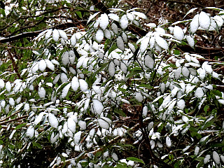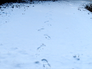 | 新城側の中腹登山口も真っ白 | 雪の積もった葉が可愛いい | 自分の足跡だけ | |||